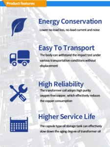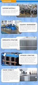 The fully sealed distribution transformer cancels the oil storage tank, and uses the fin plate of the corrugated oil tank body as the cooling element for heat dissipation, while expanding and contracting with the increase and decrease of transformer oil, which isolates the inside of the transformer from the atmosphere, it can prevent the deterioration of oil and insulation from moisture and aging, and enhance operational reliability.