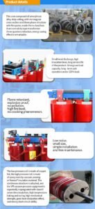 1.The high-voltage winding adopts copper wire, and the low-voltage winding is wound with copperwire or copper foil, filled and wrapped with glass fiber mat, and poured with epoxy resin without filler under vacuum state, and solidified to form a solid cylindrical whole. They have the advantages of high mechanical strength, low partial discharge and high reliability.